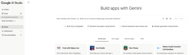 パソコンでGoogle AI Studioを検索して、Google AI Studioをブラウザで開き[Build]を選択し、枠にプロンプトを入れます。